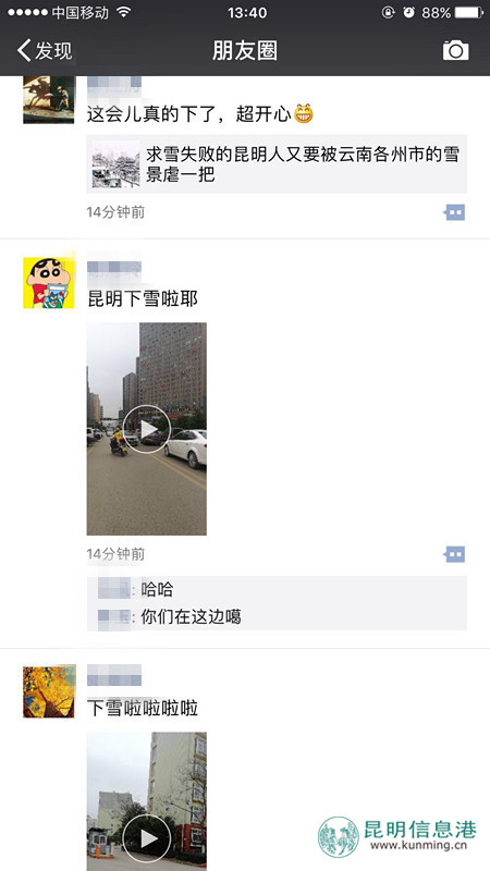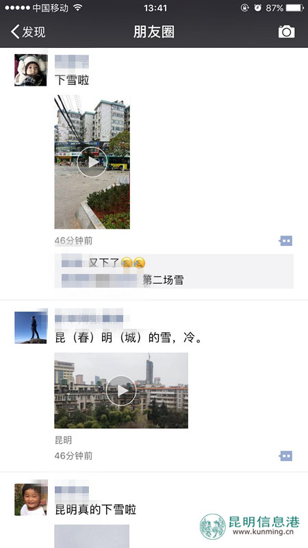 昆明信息港讯 1月12日下午13时左右,朋友圈突然被“昆明下雪啦”刷屏,一波小视频吸引了大家的目光。