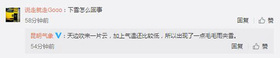 有网友去“@昆明气象”追问明明要回暖,突然下雪是怎么回事?