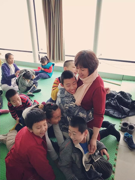 贾秀芳与康复中心的脑瘫患儿。(2017年2月14日摄)