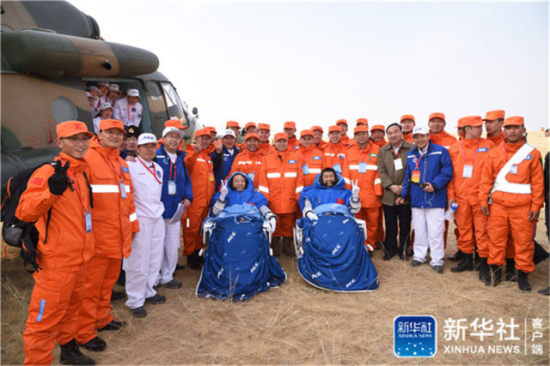 2016年11月18日,航天员景海鹏(左)、陈冬在四子王旗着陆场顺利返回。新华社发(孔方舟 摄)