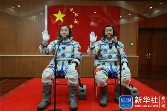 2016年10月17日,神舟十一号航天员出征仪式在酒泉卫星发射中心举行。这是航天员景海鹏(左)、陈冬在出征前挥手。新华社记者 李刚 摄