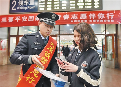 2018年春运启动后,太原铁路公安处成立学雷锋志愿者服务队,为旅客创造有序、和谐的安全出行环境。图为太原火车站派出所民警黄海波(左)为旅客送上《安全出行温馨提示卡》。旅客用手机扫卡上的二维码,即可方便地了解防盗、防骗等安全常识。何广宏/摄