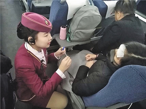 2月2日,北京铁路局石家庄客运段京成车队倾心乘务组列车员夏炜(左)在给出现发烧症状的旅客测量体温和进行物理降温。北京—成都G89、90次列车制定了个别旅客出现伤病处置、列车出现意外事故晚点等应急预案,受到旅客好评。靳艳清/摄