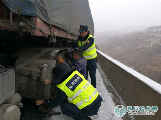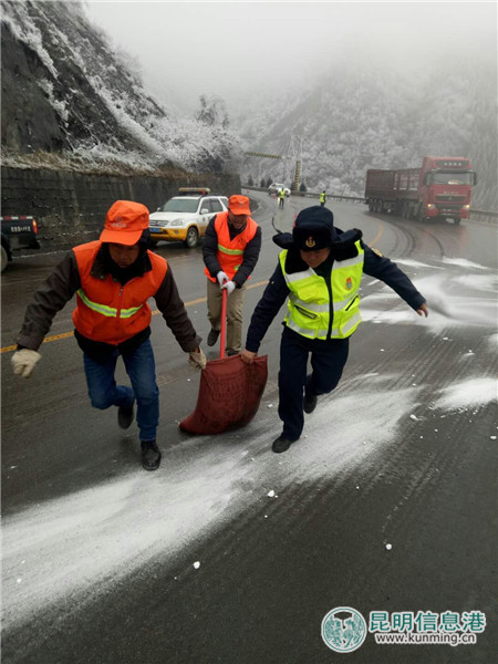 昆明信息港讯 1月27日至2月2日,昭通持续低温雨雪冰冻天气,大部区域最低气温降至0℃以下,到处白雪皑皑,一幅冰天雪地的景象,公路结冰严重,对公路通行及春运工作造成不利影响。昭通路政支队全员动员,积极投入到抗冰保通工作中,确保春运道路安全畅通。