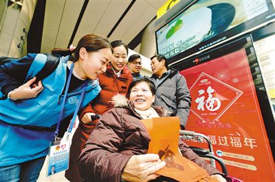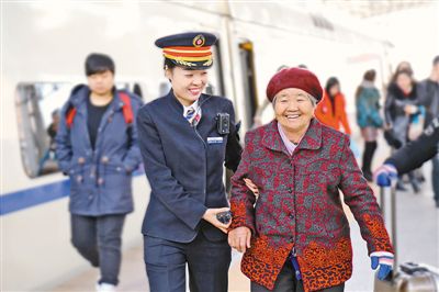 北京南站建立咨询台、服务组、流动岗等,确保第一时间发现重点旅客,并提供帮助。图为日前北京南站工作人员引导重点旅客进入列车。记者贺勇/摄