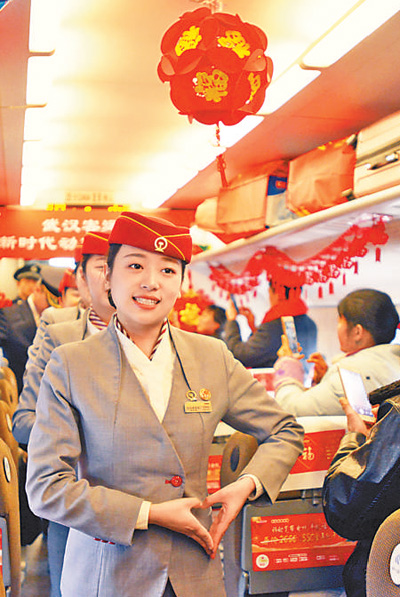 2月7日,在武汉铁路局与有关部门的组织下,500多名农民工坐上了武昌至利川的D5702次返乡“爱心专列”。图为列车员为工友们表演节目。程远州 王强/摄