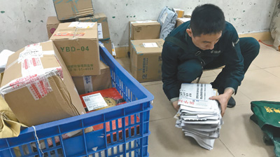 罗金城整理将投递的报刊、包裹。记者 贺林平摄