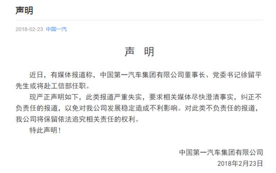 新华网北京2月24日电 昨日(23日),针对近日有媒体报道称中国第一汽车集团有限公司(以下简称中国一汽)董事长、党委书记徐留平或将赴工信部任职的消息,中国一汽发布官方声明,称此类报道严重失实,并将保留依法追究相关责任的权利。