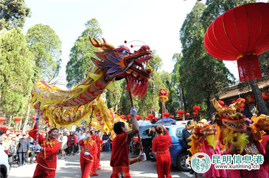 舞龙是庙会中的重头戏,欢腾喜庆的舞龙表演点燃了游客的激情,大家纷纷欢呼雀跃,鼓掌叫好。现场还有活力十足的舞狮表演、划旱船、骑驴戏春、文武财神送喜、滇剧折子戏展演等活动,这些极具特色的民俗活动让游客们仿佛回到了几十年前的老昆明。据介绍,这些非常地道的民俗活动,意图再现原汁原味的传统庙会胜景,把传统庙会原汁原味展示给更多的市民,尤其是让年轻的一代感知、体验中国传统历史文化,从而使传统得到进一步弘扬。