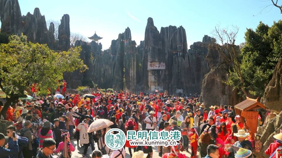 昆明信息港讯 通讯员朱永发 2月22日,记者从石林旅游局获悉,今年春节黄金周期间,石林全县共接待游客78.94万人次,同比增53.28%,创下历史新高。