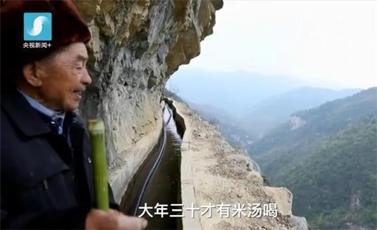 当时连请来的专业施工队都望而却步,但57岁的黄大发二话不说,把缆绳系在自己身上,让人拉着翻下了悬崖。黄支书当时也是五十多岁的人了,他都能够像这样子下去,大伙和施工队都没话可说。施工队在前面凿壁打槽,村民们在后面挑土砌堡。沿着悬崖峭壁一寸一寸凿,一尺一尺敲,水渠一米一米向前延伸。