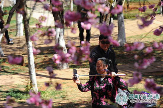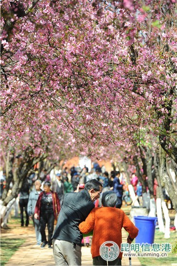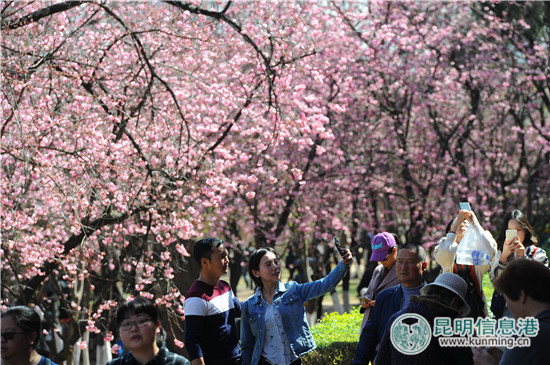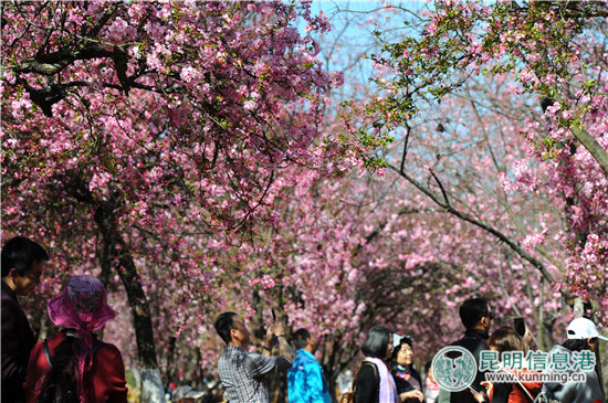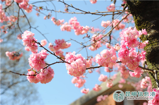 记者在园内看到,目前樱花和海棠初开。由于近日昆明天气晴好、温暖,预计本周内两花可迎来盛花期,盛花期持续2周时间,洽逢三八妇女节,“女神”们又可以来到公园与花媲美了。整个花期持续1个月时间。