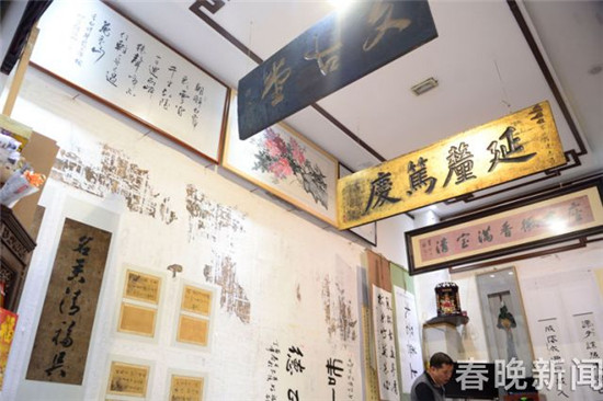 但如果抬头,便会发现这家店大有名堂。从天花板上垂吊着3块匾额依次是:黑底金字上书“文古堂”,双钩笔法带着些古朴流畅;金底黑字“延釐篤庆”,这是旧时的祝颂语,字写得大气厚重;继而是一块写着“座有微香满室清”的匾额,清隽灵动。