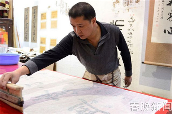 “过了不行,粘性太强裱的画就脆了;不到火候也不行,只有最合适的浆糊裱出的画才会绵润。”覃永林说,在机器时代,老辈们在装裱界的传承并未过时,且依然有着极大的优势。(春城晚报 记者连惠玲 文 翟剑 摄)