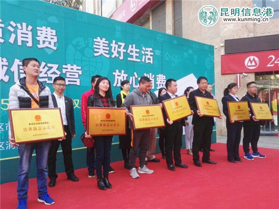 盘龙区市场监管局相关负责人宣读盘龙区消费满意示范店的批复,经公布,昆明怡美天香置业有限公司,云南得胜家居集团有限公司北站分公司,锦江麦德龙现购自运有限公司昆明北辰商场,昆明中策装饰(集团)有限公司,云南嘉华食品有限公司茨坝饼屋,盘龙区金鹅副食店,盘龙区玉莲食品店荣获盘龙区消费满意示范店企业称号,盘龙区市场监督管理局在现场为获得盘龙区消费满意示范店企业称号的企业授牌。