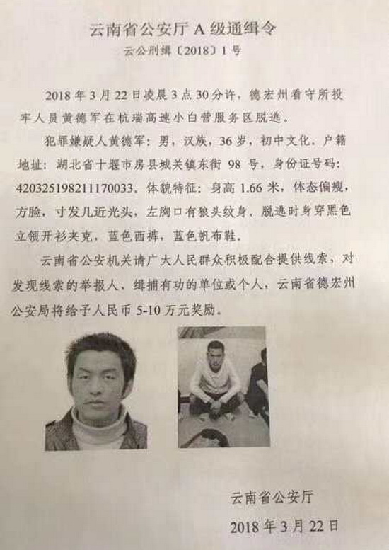 昆明信息港讯 记者江枫 合宇聪 3月22日,云南省公安厅发布A级通缉令,悬赏5至10万元缉拿投牢途中逃脱的死缓犯人黄德军。通缉令称,3月22日凌晨3点30分许,德宏州看守所投牢人员黄德军,在杭瑞高速小白营服务区脱逃。