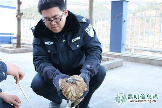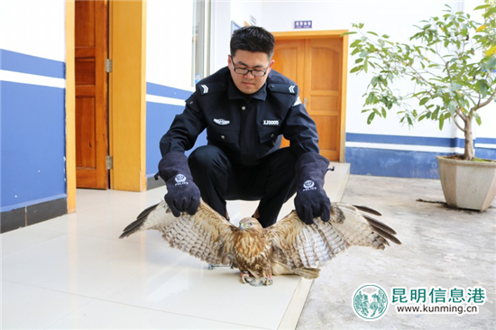 随后,民警与野生动物管理保护站工作人员取得联系,经过专业人员查阅资料,多方咨询和仔细对比,鉴定该野生动物为国家二级重点保护野生动物鵟(kuáng)。最后,民警将这只鵟移交给了昌宁县林业局耈街乡野生动物保护管理站。