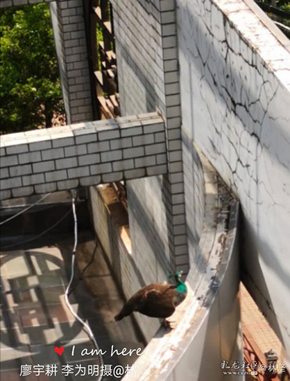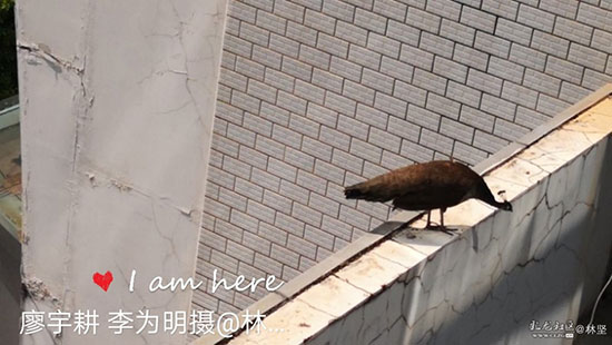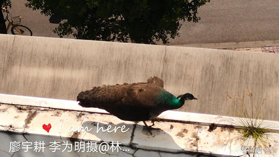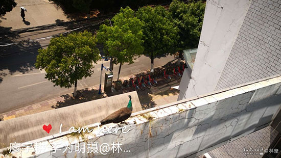 4月5日中午,省歌舞剧院廖宇耕、李为明拍了几张发现孔雀的现场照片,只见这只孔雀羽翼不长,或在高楼上踱步;或看看楼下的街景;累了就坐下来,正好中午阳光灿烂,干脆眯上眼睛休息起来。尽管孔雀在的地方离地面有些高,但它丝毫没有恐高症。