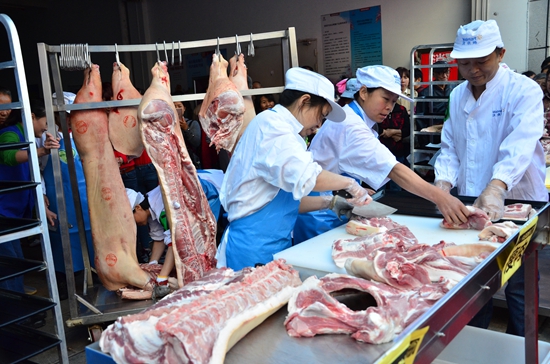 技能大赛共分猪肉精分割赛、虹鳟鱼精分割赛、蛋糕创意裱花赛、熟食烤鸡腿赛、快速点钞识钞赛、服装叠台展示赛6个竞赛项目。比赛现场,各项目选手都拿出最好状态,高水平完成比赛。在猪肉精分割赛中,只见选手们个个刀法娴熟,分割、剔骨、去皮、切肉,一阵手起刀落,仅仅10分钟的时间将半扇四十公斤重的大猪肉一条条分解到托盘中,而且每块重量不超过500克,块块品相上佳。精湛的技艺惊呆了现场的所有围观者,还有标花师的现场表演也给现场观众留下了深刻印象。