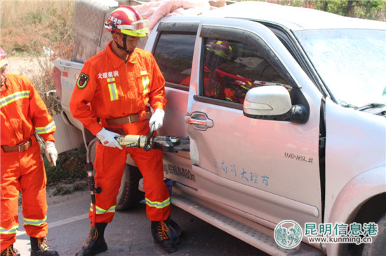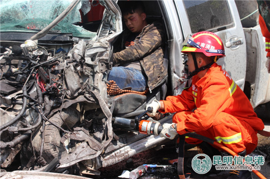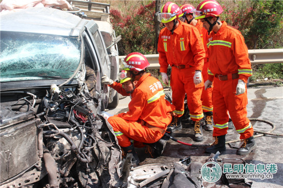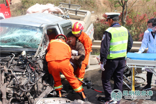 昆明信息港讯 记者劳学丽 4月13日10时39分,大理南涧县公安消防大队接到群众报警称,祥临公路南涧县碧溪乡脉处粒村段发生一起大货车与皮卡车相撞的交通事故,事故中1人被困,急需救援,该大队立即出动1车9人赶赴现场进行处置。