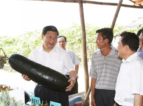 当过农民的习近平,对农业十分熟悉。2010年4月,他在乐东县卧龙岭现代农业生产基地,看到丰收场景,情不自禁地抱起一个大冬瓜掂量起来。