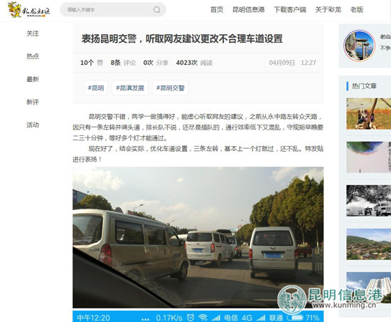 昆明信息港讯 记者合宇聪 日前,有网友在昆明信息港(www.kunming.cn)彩龙社区(www.clzg.cn)发帖表扬昆明交警,称昆明交警能虚心听取网友的建议,及时更改了设置不合理的车道。该帖发出立刻引起彩龙网友跟评,纷纷为昆明交警点赞。