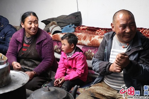2018年5月9日,白玛江才(右)、妻子那贡(左)与那贡妹妹的孩子(中)。中国网记者 吴佳潼 摄