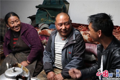 白玛江才(中)和妻子(那贡)与山南市工作人员交谈。中国网记者 吴佳潼 摄