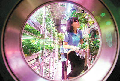 刘红介绍,“月宫365”实验在世界上首次建立了系统长期稳定运行的生物调控技术,并通过实验过程中不同代谢水平的乘员组换班更替、停电及设备故障冲击等突发状况验证了该技术的有效性;分析了不同工作状况下生物再生生命保障系统的稳定性,明确了影响生物再生生命保障系统的可靠性的关键因素;发现了在幽闭空间中自然光制度变换对人的生物节律和情绪的影响规律, 发明了模拟自然光变换调节人体生物节律和情绪的技术和设备;并建立了植物长期连续高效栽培技术、营养液长期循环利用净化和调配技术。