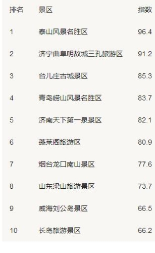 据了解,泰山风景名胜区以96.4的综合得分遥遥领先,位居第一;济宁曲阜明故城三孔旅游区位居第二,台儿庄古城景区紧随其后,位列第三位,青岛市崂山风景名胜区位列第四。旅游影响力指数是衡量旅游目的地、旅游企业对旅游者的影响程度的重要指标,是旅游软实力的重要组成部分。除了旅游资源、企业规模等基础条件外,构成旅游影响力的因素包括管理能力、传播能力及口碑。