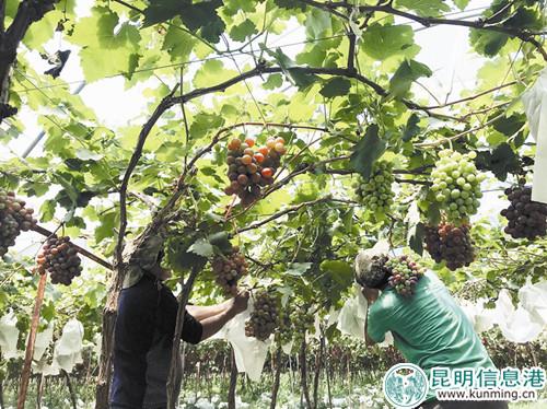 昆明信息港(昆明日报 记者张星宇 实习记者胡耀元)6月的小江河谷气温接近40℃,比温度更火热的,是紫牛村红提种植基地里繁忙的景象。取袋、剪枝、摘果,工人将葡萄装箱完毕后发往北京、上海、广州等城市。这里的葡萄比其他地方提前两个月上市,市场价格高。去年,1276亩葡萄产量达3000吨,产值近5000万元。