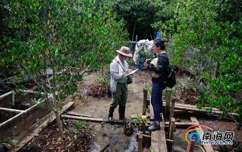工作人员冯尔辉向记者介绍红树林。南海网记者刘洋 摄