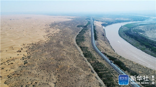 ↑包兰铁路在防护带的保护下沿着黄河穿过腾格里沙漠(5月30日无人机拍摄)。新华社记者 卢鹰 摄