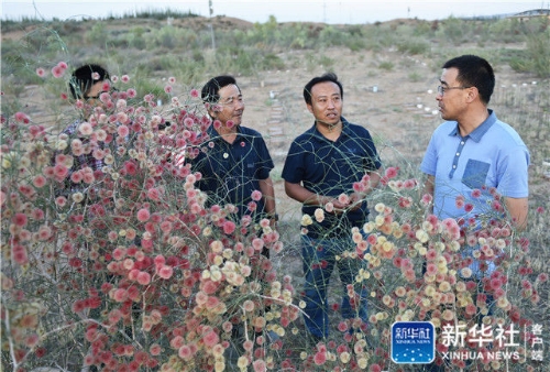 ↑中科院沙坡头沙漠研究试验站副站长张志山(右一)在和同事讨论研究沙生植物(6月10日摄)。新华社记者 卢鹰 摄