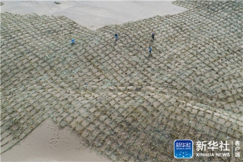 绵延的腾格里沙漠一望无际,在位于宁夏、内蒙古交界处的长流水沙治项目区,每天都有上千亩的流动沙丘被草方格紧紧锁住。