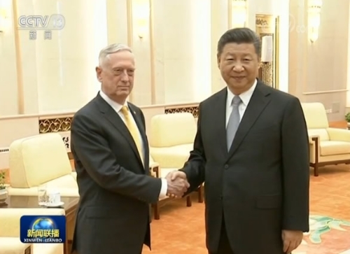 国家主席习近平27日在人民大会堂会见了来访的美国国防部长马蒂斯。
