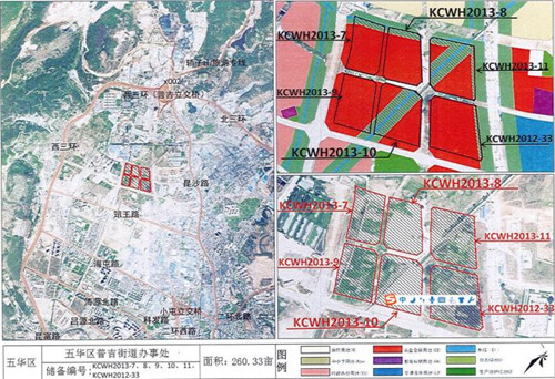 地块出让信息显示,此次拍卖的6宗土地编号分别为KCWH2012-33、KCWH2013-7、KCWH2013-8、KCWH2013-9、KCWH2013-10、KCWH2013-11号,面积共173468.91㎡(约260.2亩)。土地性质为零售商业、批发市场、餐饮、旅馆、商务金融、娱乐用地兼容城镇住宅用地。交易起价140348.7万元,起拍楼面价约1620元/平米,土地单价约486-648万元/亩。地块位于昆明市五华区普吉街道办事处,南临陈家营路隅山公园,北临沙河北路,西临金川路,东临京昆高速。