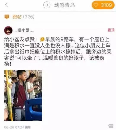 小学生刘显昊这一暖心举动被网友“妍小爱”拍了下来并发到了网上,短短时间就吸引了众多网友的跟帖和点赞。“从小朋友上车擦座位到让座,也就一站路的工夫,但深深地触动了我,给我们这些大人上了一课!”