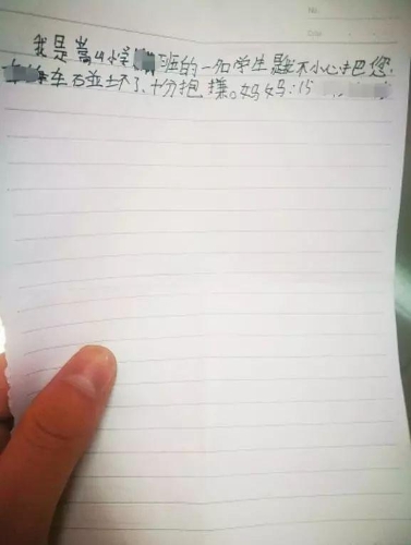 2018年4月19日,鹤壁一位车主的爱车被剐蹭后,他不仅没有生气,反而十分感动,因为肇事者是一名小学生,这个可爱的孩子在现场留下了一张带有自己家长联系方式的字条,表达歉意并愿意赔偿。