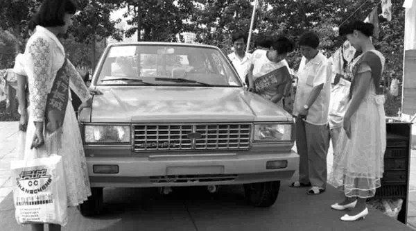 1990年第一届北京车展,长城汽车工业公司二分厂生产的轿车,人们新奇地围在车旁