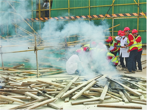 演练现场模拟建筑工程项目发生脚手架坍塌和火灾事故等进行综合应急救援。项目施工单位,辖区消防、医疗、公安等部门参加了救援。救援工作及时、有序、高效,并能妥善处置事故、排除隐患,达到了防止事故扩大或发生次生事故、最大限度地减少人员伤亡和财产损失的目的,有效地锻炼了应急救援队伍。
