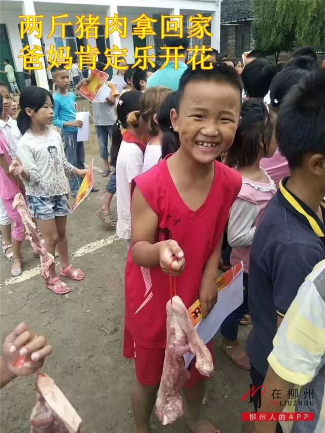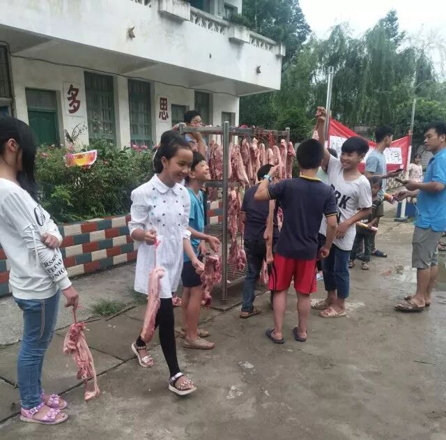 张校长说,知了小学一到六年级共178名学生,有90%以上都是留守儿童。以前每年散学典礼,给学生奖励的都是本子之类的学习用品,这次发猪肉,学生和家人都很高兴。