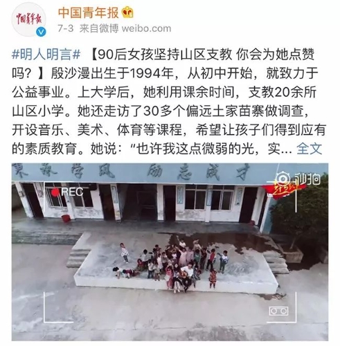 每次支教后殷沙漫喜欢用文字记录点滴这是她在其中一篇散文中写下的:“走你走过的路,吃你吃过的野菜,住你住过的木屋,经历你经历的贫困。原谅我的肩膀不够宽,但想给你无尽的温暖;我的背梁不够挺,但想给你撑起一抹蔚蓝;我的声音不够亮,但我想给你唱起小小的梦想。”