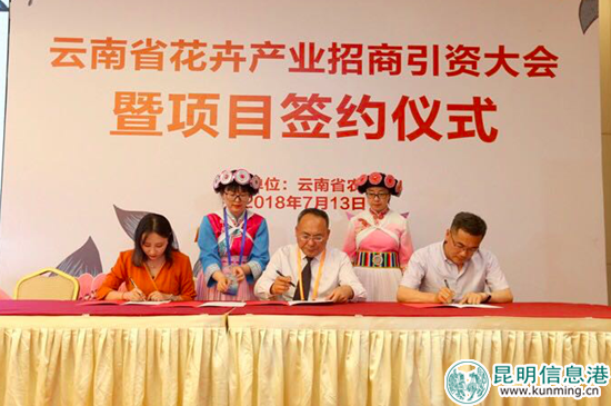 昆明信息港讯 7月13日下午,第十九届中国昆明国际花卉展举行云南花卉产业招商引资大会暨项目签约仪式。仪式上,12个投资项目成功签约,预示着云花产业发展又向前迈出了坚实的一步。