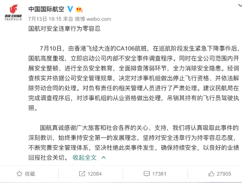 近日国航CA106从香港飞往大连途中,曾10分钟内紧急下降25000英尺(约7620米),导致机舱内的氧气面罩掉落。飞机最终安全抵达目的地。事件由该机组副驾驶人员抽电子烟时误关空调所致。7月13日国航官方微博回应称经调查核实并依据公司安全管理规章,决定对涉事机组做出停止飞行资格、并依法解除劳动合同的处理。对负有责任的相关管理人员进行了严肃处理。为何民航要求旅客全程禁烟,而驾驶舱里的飞行员为何可以吸烟?