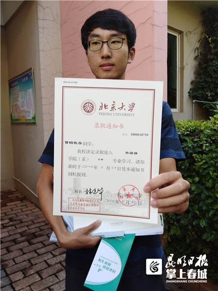 “收到北京大学录取通知书有种特别的感觉,这意味着我的高中生活已画上圆满的句号,即将开启美好的大学生活。”7月16日上午10点50分左右,曾昭牧吾在接过云南邮政EMS投递员送达的北京大学高考录取通知书时高兴地说。曾昭牧吾告诉记者,他毕业于云南师范大学附中,今年高考总分683分(文科),位次是云南全省第16名。当谈到成绩时,曾昭牧吾透露,他月考时成绩也考砸过,这次考出理想的成绩,除平时好好学习外,最关键的是要调整好心态,现在拿到通知书,他想去旅游一趟。