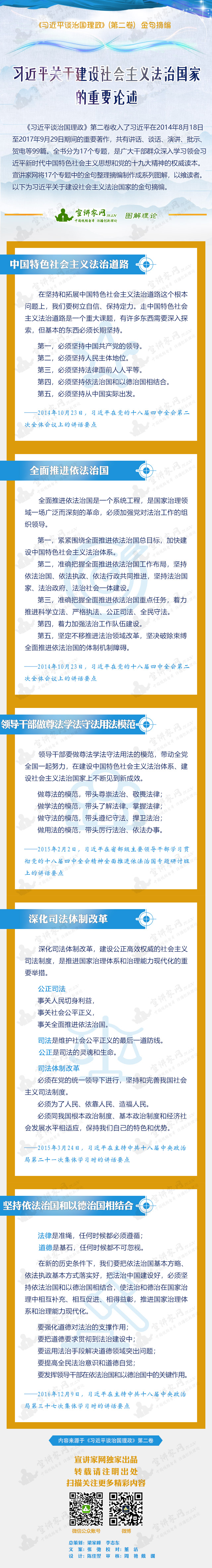 摘要:《习近平谈治国理政》第二卷收入了习近平在2014年8月18日至2017年9月29日期间的重要著作,共有讲话、谈话、演讲、批示、贺电等99篇。全书分为17个专题,是广大干部群众深入学习领会习近平新时代中国特色社会主义思想和党的十九大精神的权威读本。宣讲家网将17个专题中的金句整理摘编制作成系列图解,以飨读者,以下为习近平关于建设社会主义法治国家的金句图解。