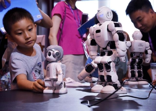 (7月21日,观众在青岛举行的2018中国国际消费电子博览会上观看机器人展示。新华社记者李紫恒摄)