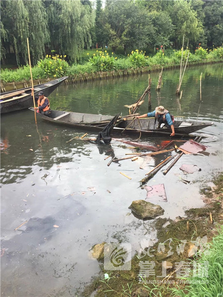 昆明信息港讯(昆明日报 记者孙潇/文 赵伟/摄) 7月26日,昆明市滇池管理综合行政执法局会同西山区水务(滇管)局,对船房河入湖口及永昌湿地内残留木桩、窝棚等进行取缔拆除,同时对入湖及湖滨带内的垃圾漂浮物进行清理打捞。经过两小时左右的清理,执法部门从河道中清理出垃圾、杂物等共计五吨左右。