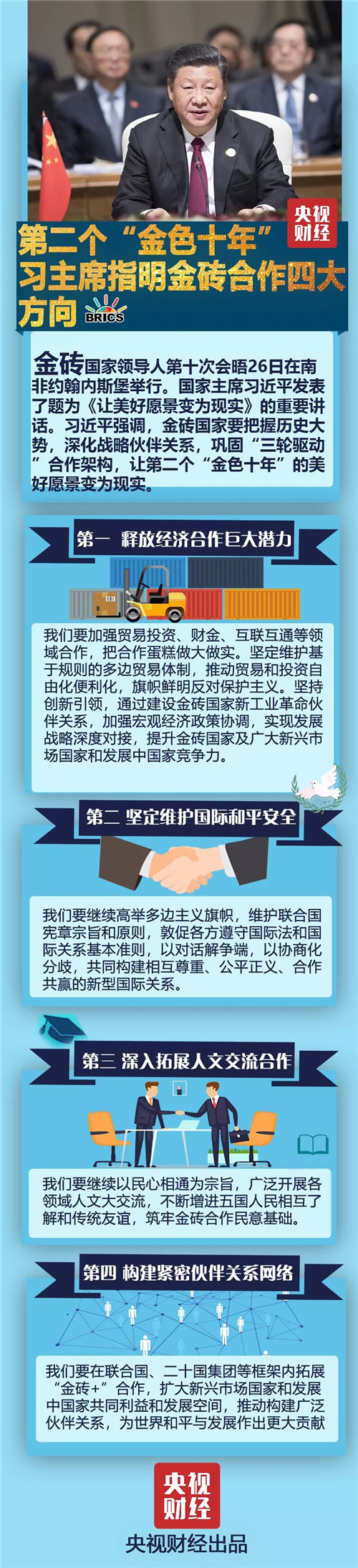 今年是金砖合作第二个“金色十年”的开局之年,金砖国家领导人第十次会晤将取得哪些成果?在全球保护主义盛行、多边贸易体制经受重大挑战的严峻环境面前,金砖国家又如何将挑战化为合作动力,构建开放型世界经济和创新合作模式,创造下一个金色十年?